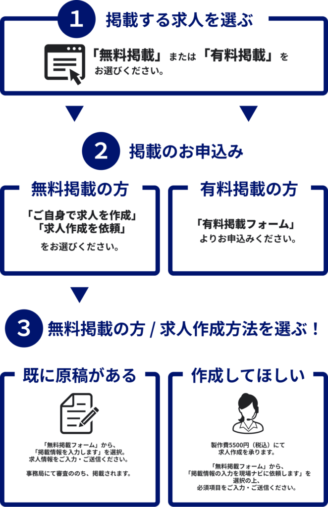 現場ナビの求人掲載と同じ流れで、すぐに始められます。