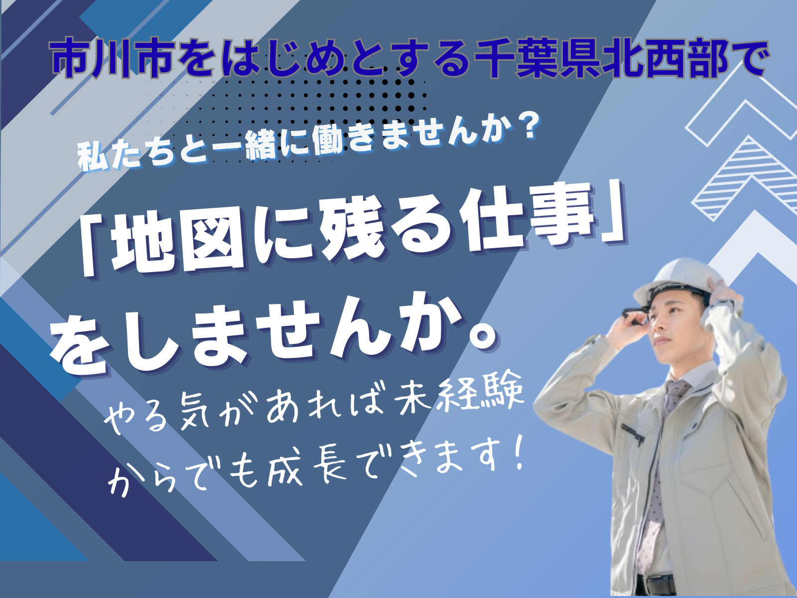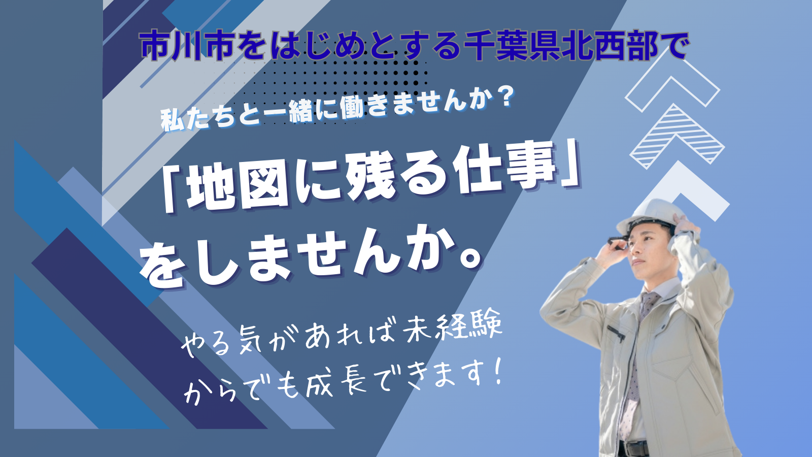 市川市をはじめとする千葉県北西部で、腰を据えて「地図に残る仕事」をしませんか。「教え合う文化」があるので、やる気があれば未経験からでも成長できます。