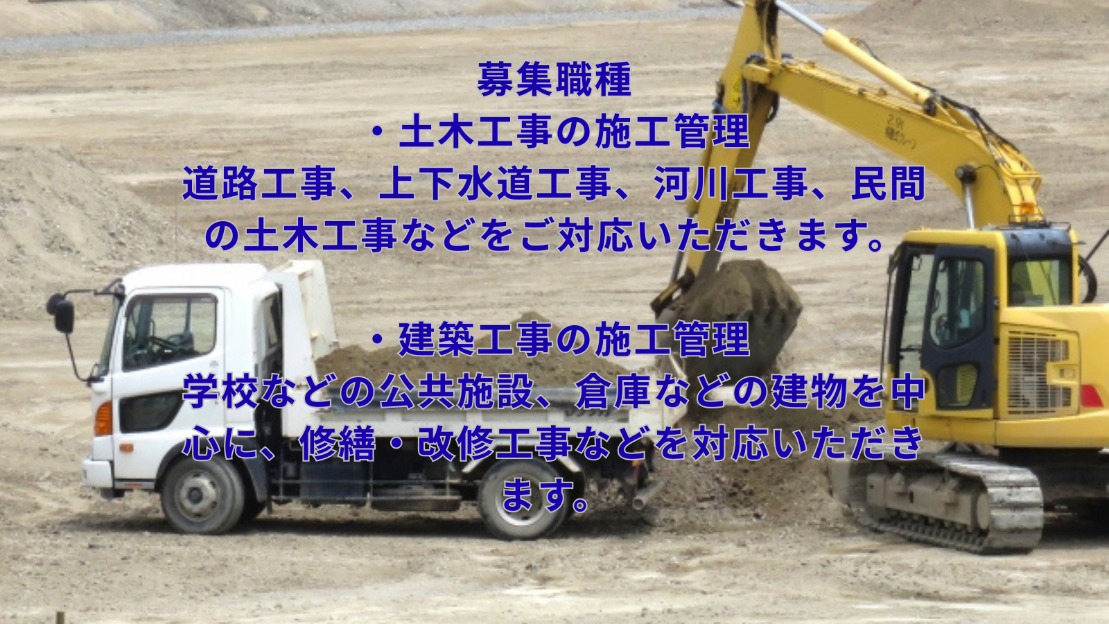 道路工事、上下水道工事、河川工事、民間の土木工事などをご対応いただきます。